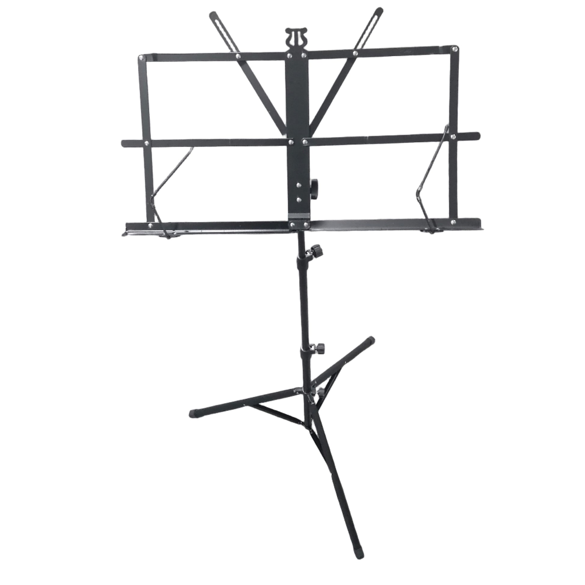 Basic adjustable and foldable stainless steel music stand in black, with zipped carry bag.