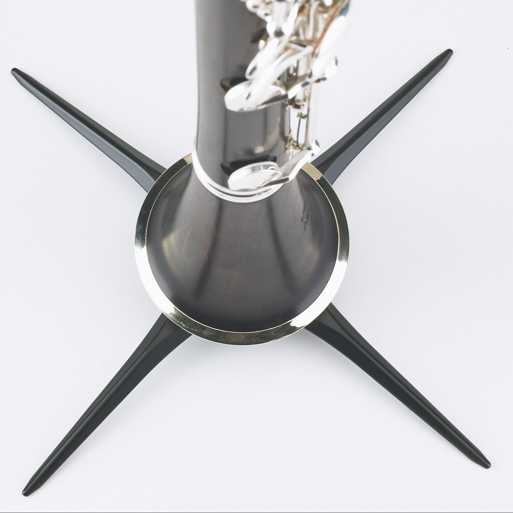 Unique, compact clarinet stand with black plastic peg which fits A and Bb clarinets. The 4-leg base provides maximum stability for the instrument. The detachable metal leg base screws into the peg so that the entire unit can be stored in the bell of the instrument. Also fits oboes, due to slimmer and taller shape.