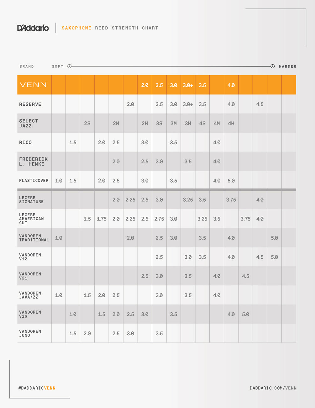 D'Addario VENN: an advanced synthetic reed constructed of polymer fibers, resin, and natural cane elements. Designed to give players the benefits of synthetic reeds without compromising on the sound and playability of cane reeds.